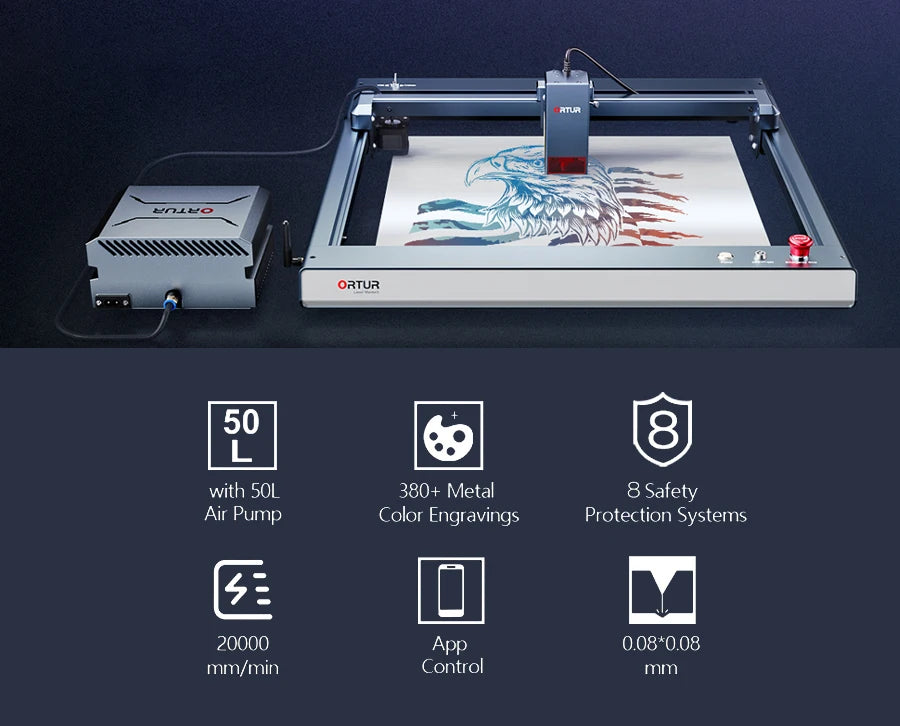 Super Powerful OLM3 LU3-20A laser beam oxidizes the metallic surface in an instant, bringing vivid colors to the engraved metal. Come and travel together to a more colorful engraving world with Ortur Laser Master 3 LU3-20A.